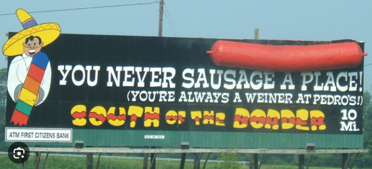 For those of you on the east coast, starting in Virginia, going south on I-95, you used to see (I’m not sure if they’re still there or not,) billboards every 15 miles or so for a place called, South of the Border, between North and South Carolina. There were so many of these billboards and as a child, I read each one, wanting to go to this seemingly amazing place.